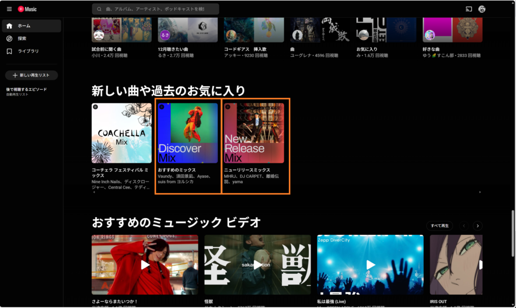 Youtube Musicの「おすすめのミックス」「ニューリリースミックス」はホーム画面からアクセスできます(下画像のオレンジ枠)。