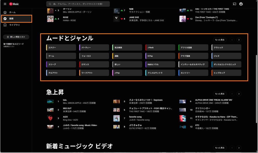 ジャンルで探したい気分のときには「探索」の「ムードとジャンル」から辿ったりします。