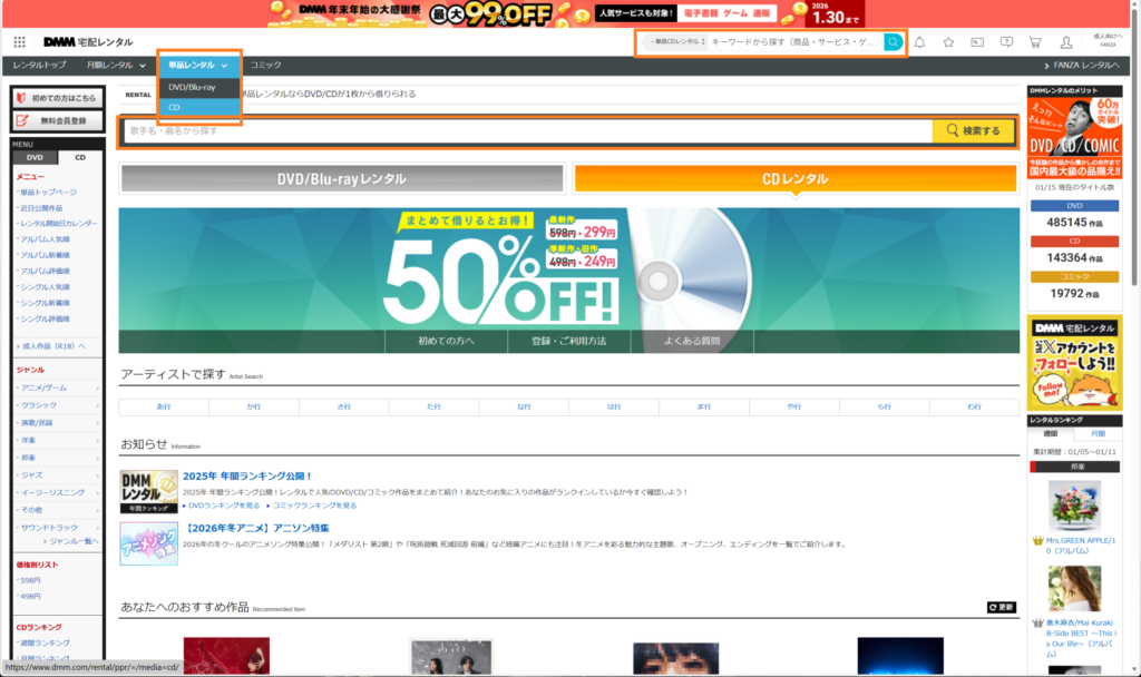 DMMの宅配単品CDレンタルは宅配レンタルのページから「単品レンタル」のメニュー内の「CD」を選択すると表示できます(下画像の左上オレンジ枠)。※「DVD/BD-ray」と間違えやすいので注意
