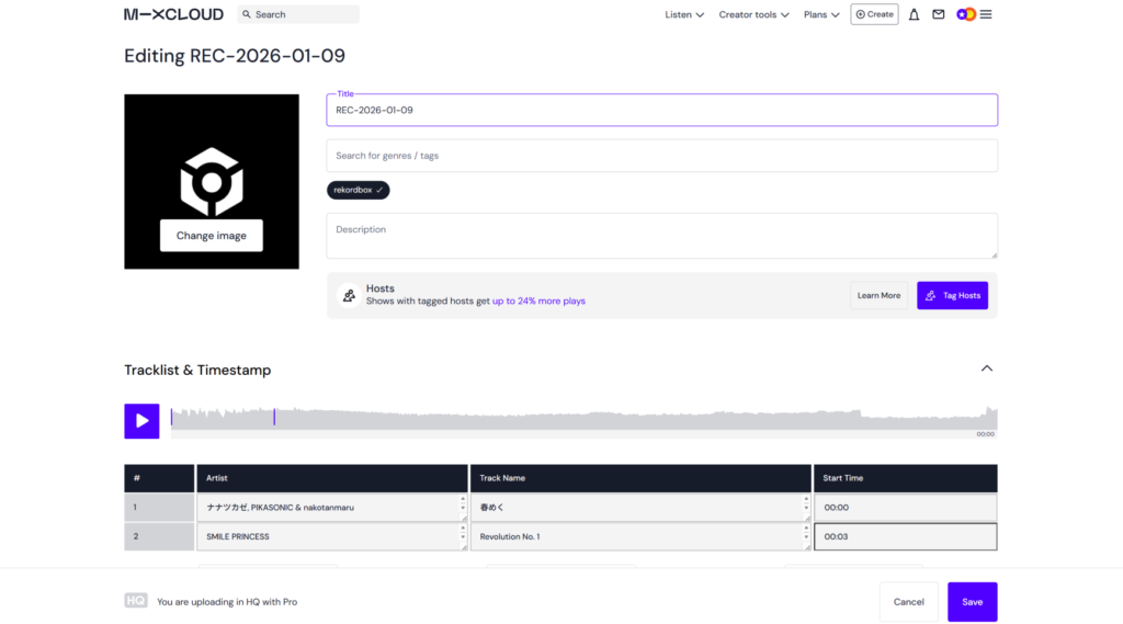 (使用楽曲やタイムスタンプはさきほどのアップロード面画の下部にある「Traclist &Timstamp」です。rekordboxからアップロードすればこれらは自動でつけてくれます)