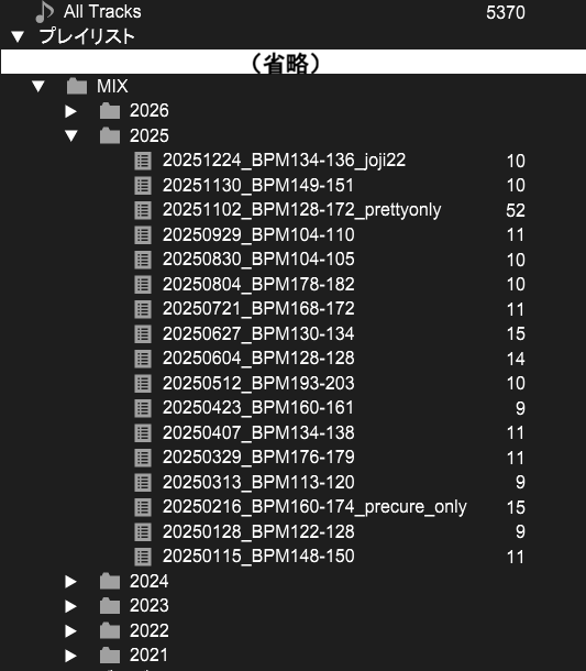 デフォルトで存在する「プレイリスト」配下に「MIX」というフォルダを作って、その下にDJ-MIX作成で使用したプレイリストを年ごとのフォルダ配下に入れている、というような形です。