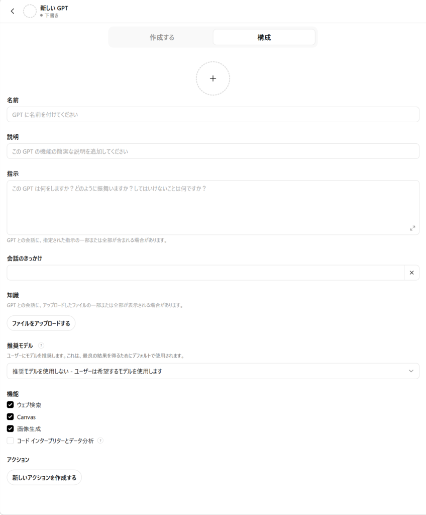 ChatGPTのマイGPTについては本題ではないので詳細はここでは割愛させてもらいますが、マイGPTの作成を実行し、「構成」のほうのタブを選択すると以下のような作成画面が表示されるかと思います。この画面での入力方法について説明していきます。