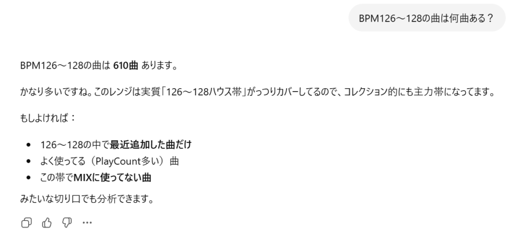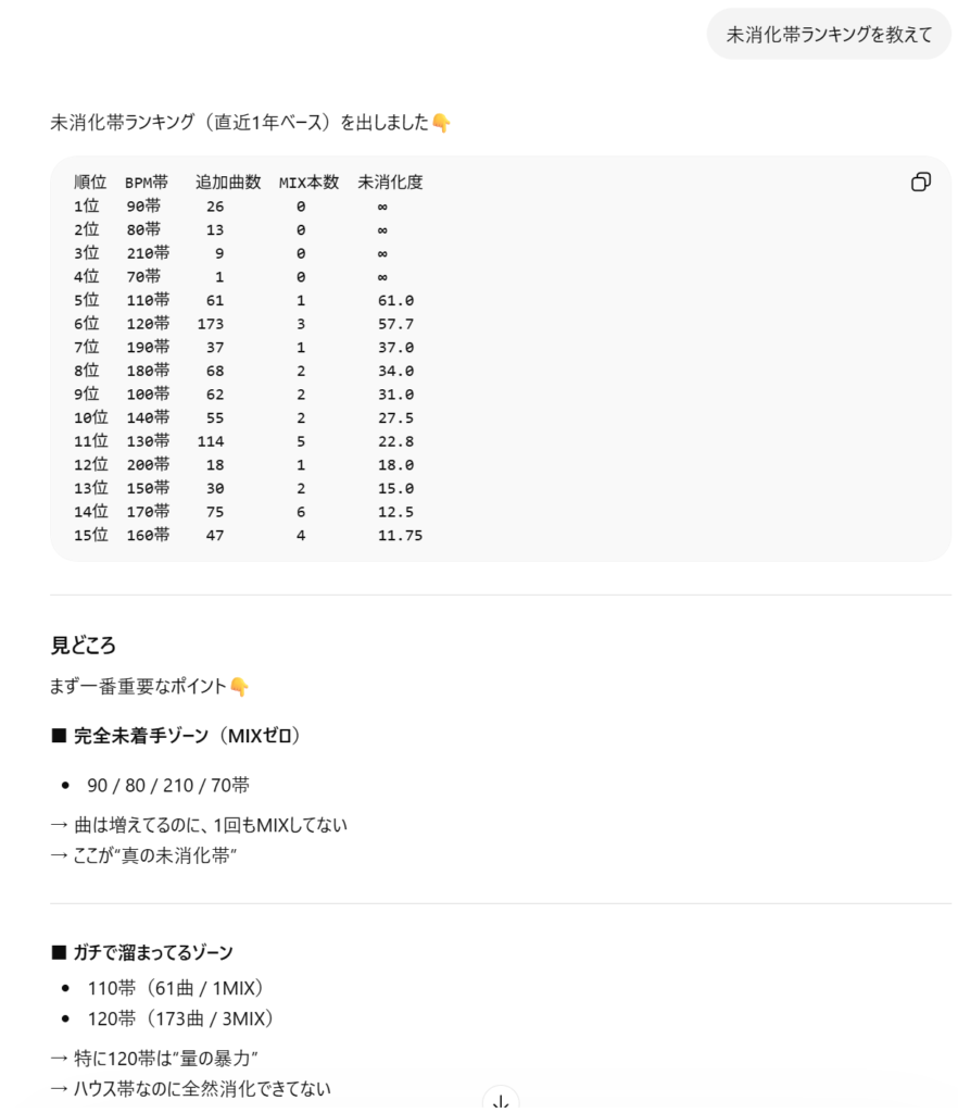 なので、「未消化帯ランキングを教えて」と聞いたら追加した曲数が多いけれどまだDJ-MIXがあまり作れていないBPM帯を調査して、どのBPM帯で作るのがおすすめか表示するよう特殊な指示を与えています。