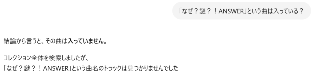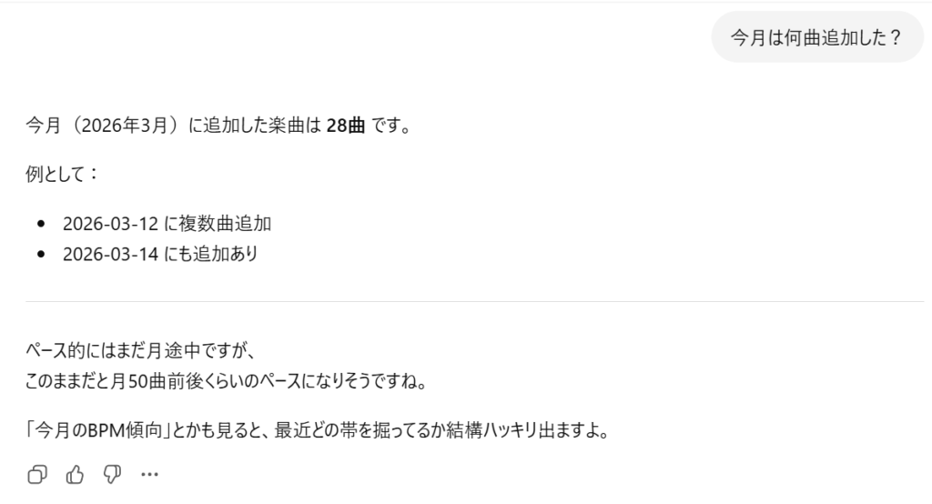 自分は女児アニのシリーズごとにタグ付けしたりするので、タグ情報もマイGPTに持たせたら各シリーズ単位に何曲入っているか、どのBPMの曲が多いか、とか確認したりするのに役立つと思っている。ただ、タグ情報をどこから引っ張ってくればいいのかまだわかってないので実装できていない(少なくともコレクションをエクスポートしたファイルの中には無かった)。
