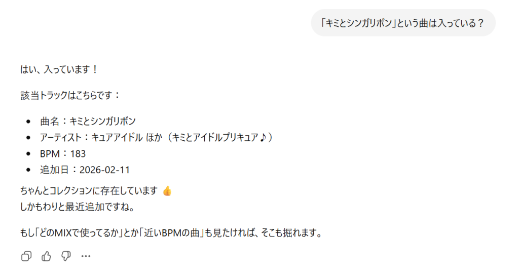 また、マイGPTを使わず調べる場合だとrekordboxを起動して直接自分で検索をかけるなどしていかなければいけませんが、マイGPTであればしゃべりかけるように質問すれば確認して回答してくれるので手間もだいぶ減ります。