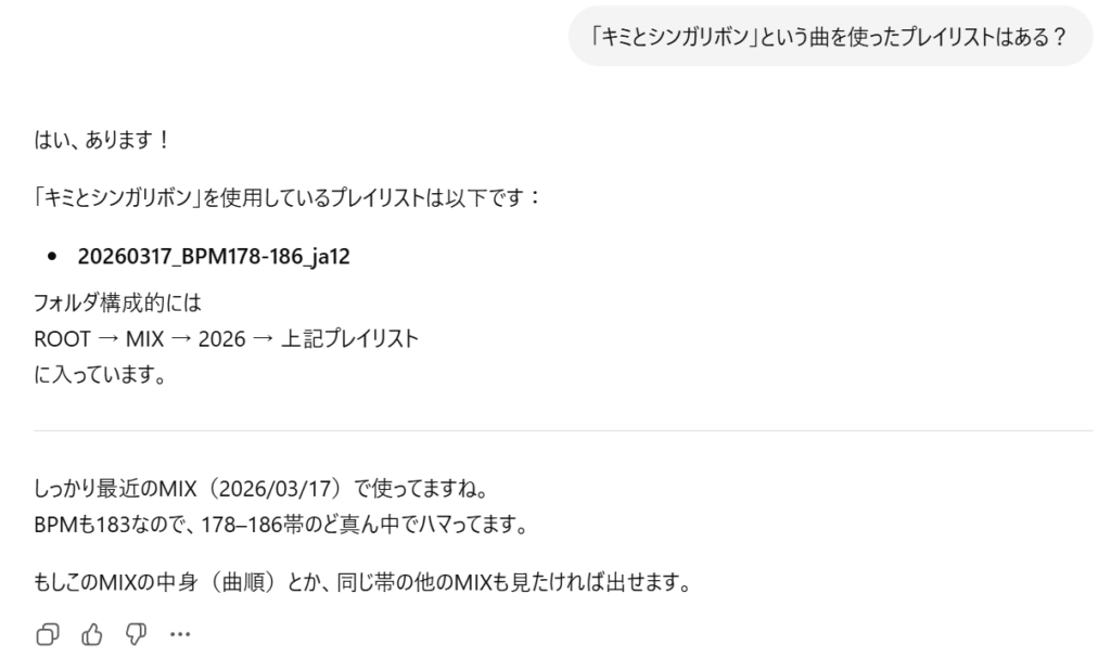 これらの確認のためにPC起動してrekordbox起動して検索して、、、なんてめんどくさいので、rekordboxからエクスポートした情報をマイGPT(※)に持たせて、「この曲入ってる?」とか「この曲セットリストで使ったことある?」とかをいつでもどこでも質問できるようにしたという記事になります。