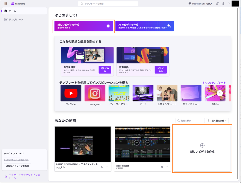 Clipchampにログインすると以下画像のような画面になります。この画面で「新しいビデオを作成」(下画像のオレンジ枠部分。上下2か所ありますがどちらでもよいです)を押してまずは新しくプロジェクトを作成します。