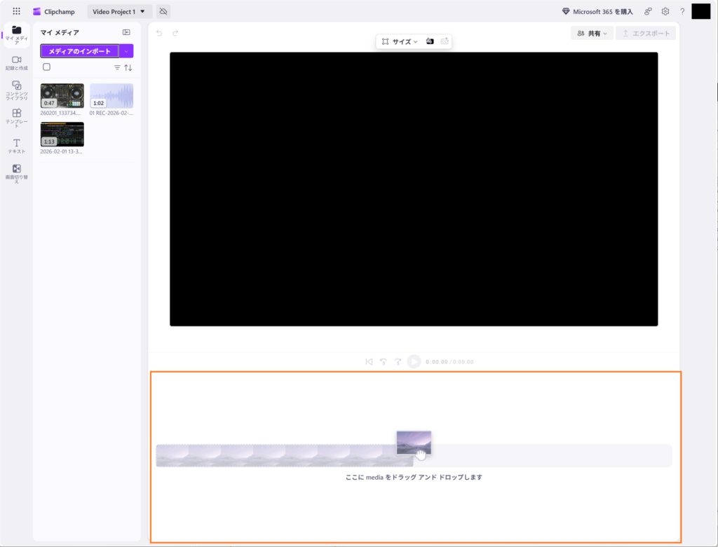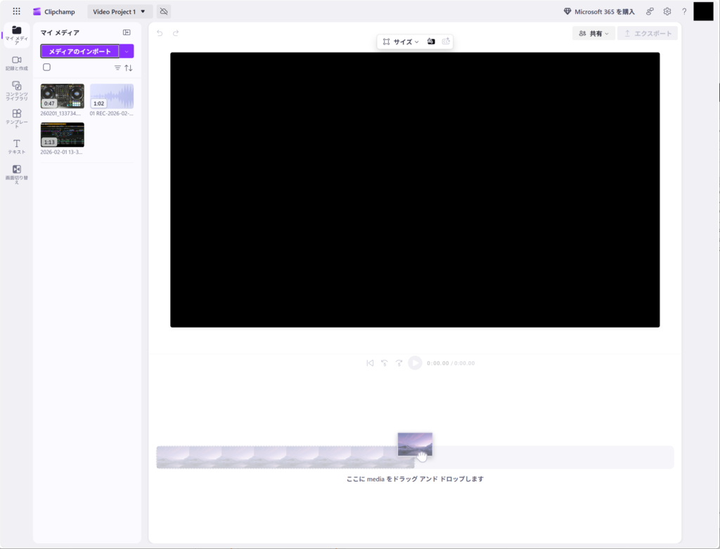 具体的な編集手順に入ります。(Clipchampへのログイン手順はここでは割愛しますのでログイン後からの作業手順になります)
