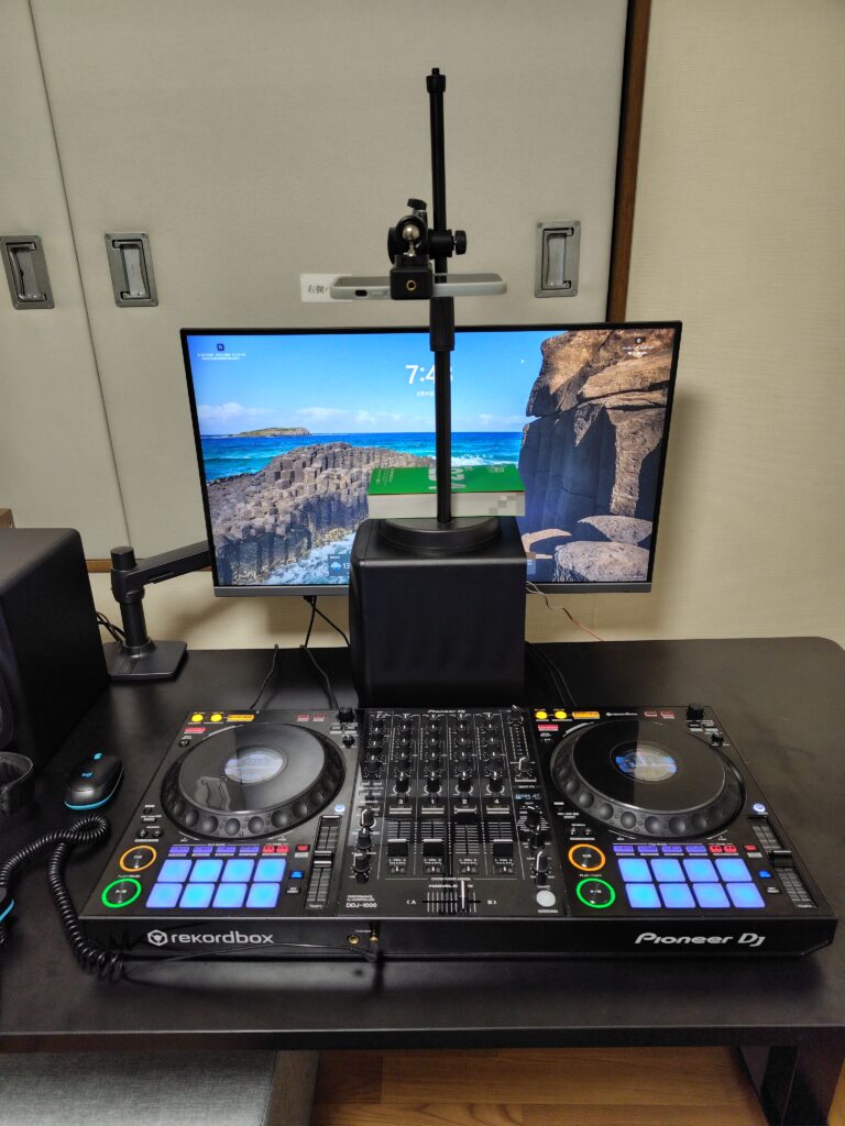どうセッティングするはお使いの商品によって異なりますが、基本的にはDJ機材は横長の長方形ですので、画像のようにDJ機材の奥に配置し、スマホを固定するアームが手前に来るような配置にするのが撮りやすいと思います。自分の場合だと以下のような感じになります。