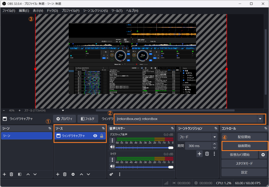 - 録画したいDJソフト(画像の例ではrekordbox)とOBS Studioを起動