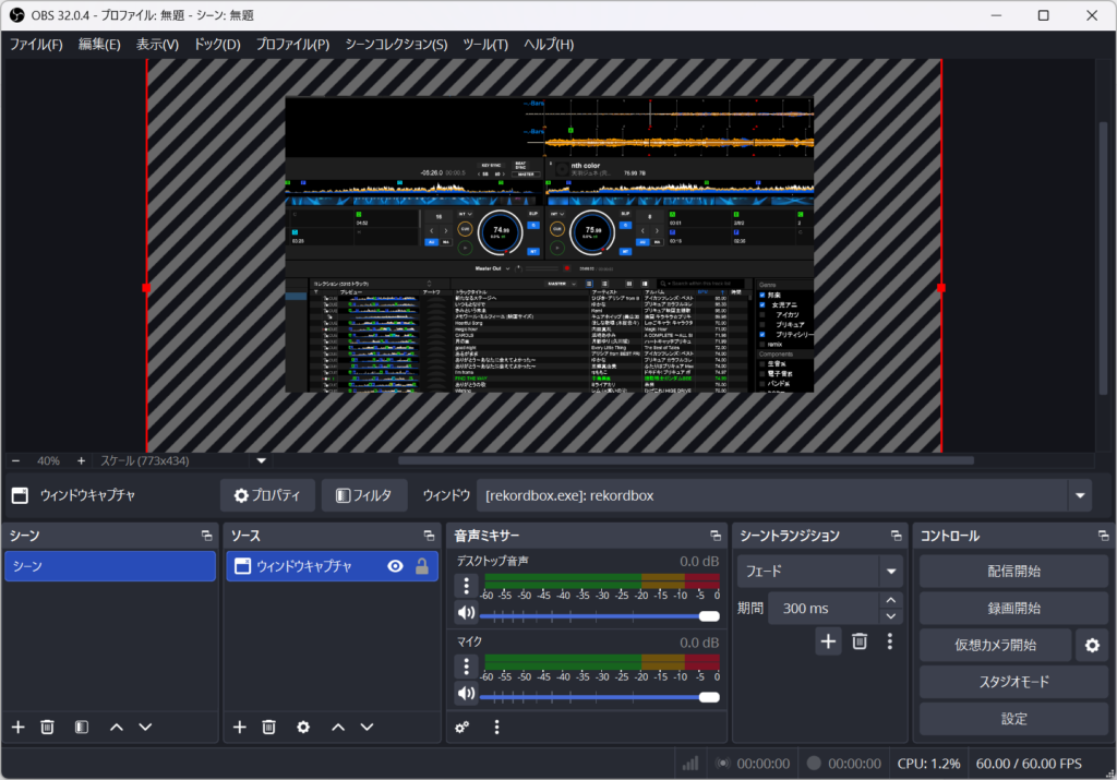 PC側ではrekordbox、OBS Studioを起動し、さきほどの手順の通りOBS Studioでrekordbox画面を選択して移す画面を確認します。