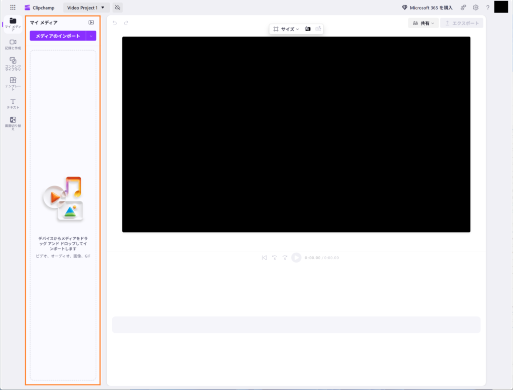 「新しいビデオを作成」を押すと以下のようなプロジェクトの画面になります。左側の「マイメディア」(左側のオレンジ枠)から用意した三つの動画素材をインポートします。インポートはファイルをドラッグアンドドロップするか、「メディアのインポート」を押してファイル選択するかのどちらかになります。