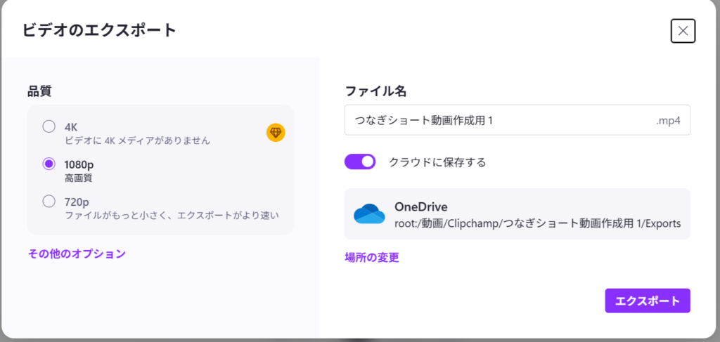 Clipchampで編集作業が全て終わったら最後に頭から再生して問題ないか確認します。満足いくものができたら動画の「エクスポート」を行い最終的な動画ファイルを作成します。