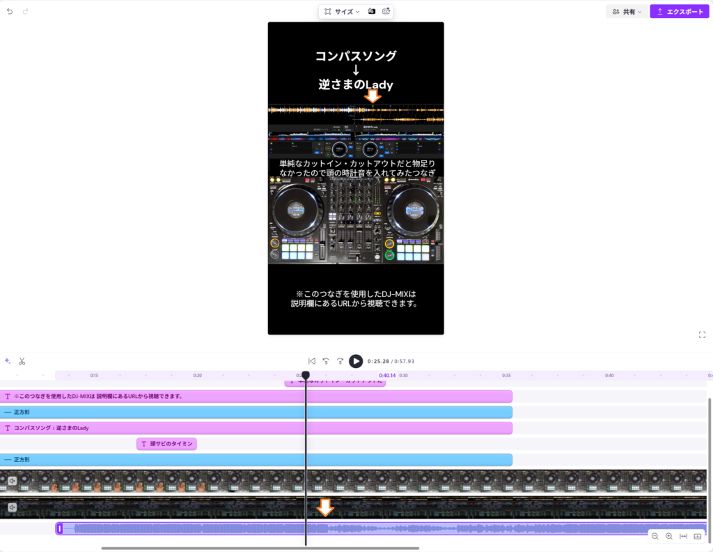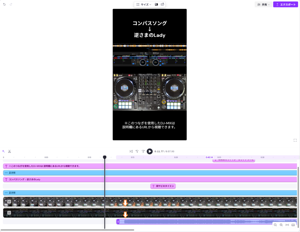 各素材の撮影・録音の開始・停止を完全に同時にすることはまずできないので、長さやDJプレイが始まるタイミングなどが下画像のようにバラバラになってしまいます。(オレンジ矢印箇所が各素材での曲の再生開始位置になります)
