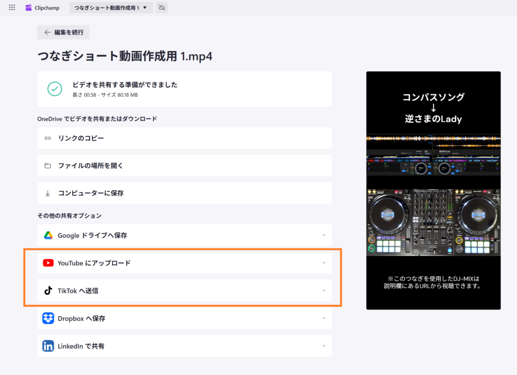 各媒体への具体的なアップロード方法はここでは割愛しますが、ClipchampであればYoutube、TikTokへのアップロードは動画ファイル作成完了の画面からそのまま実施できます。(自分はYouTubeへのアップロードしかしないので、画像はYouTubeの場合の画面になります)
