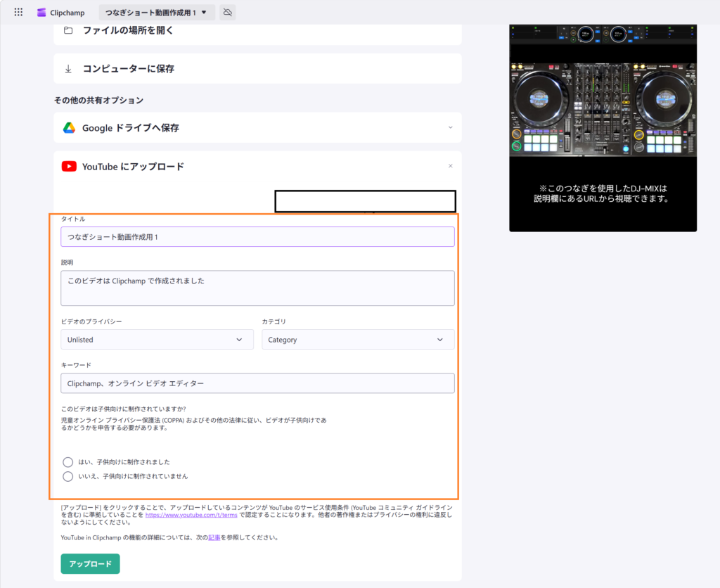 アカウントに接続すると動画のタイトルや説明など、動画のアップロードに必要な値を設定する画面になりますので、画面に従って入力していきます。