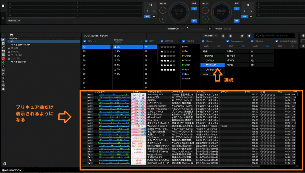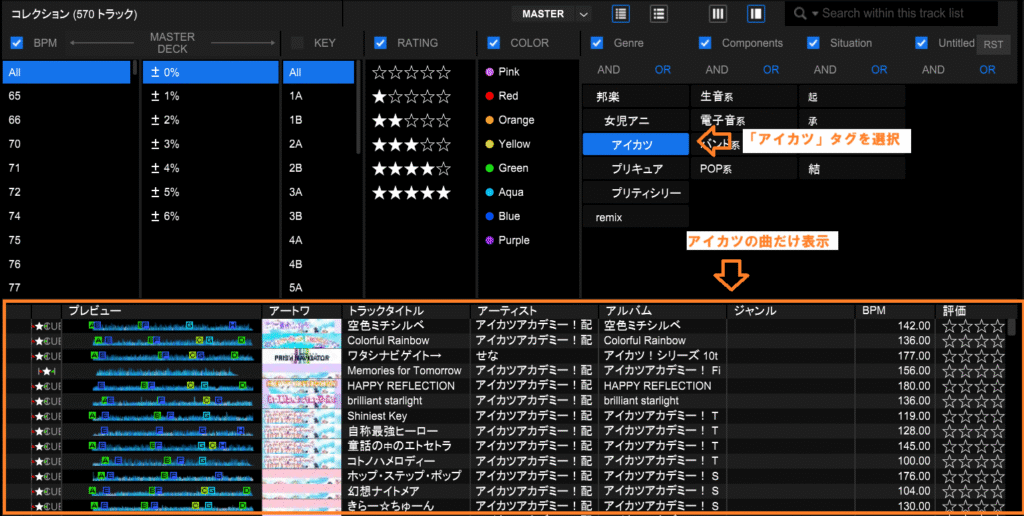 こうしておけば例えばアイカツシリーズでDJ-MIX作成しようってなったらトラックフィルターで「アイカツ」のタグだけ選択すればアイカツの曲だけコレクションに表示されて、曲が探しやすくなります。