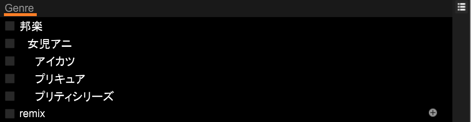 例えばアイカツの曲であれば「邦楽」「女児アニ」「アイカツ」をつけるし、女児アニ以外のアニソンであれば「邦楽」だけつけとくって感じです。