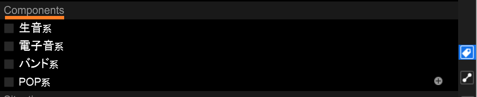 なので「アニソン」「J-POP」「ボカロ」とか、その曲が生まれた音楽シーンとかどの文脈の音楽なのかというところで分類して、音楽的な分類としては次の「Components」で分類できるようにするという風に自分はしています。