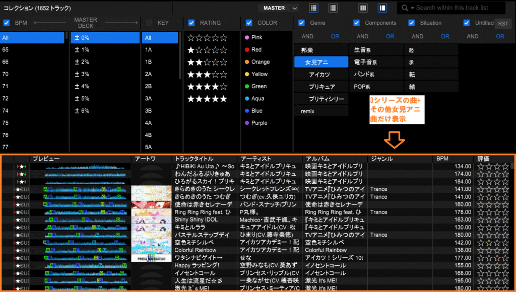 同様に女児アニ全般でDJ-MIX作成しているときは「女児アニ」タグを選択すれば3シリーズ含めた女児アニ曲だけ表示されます。