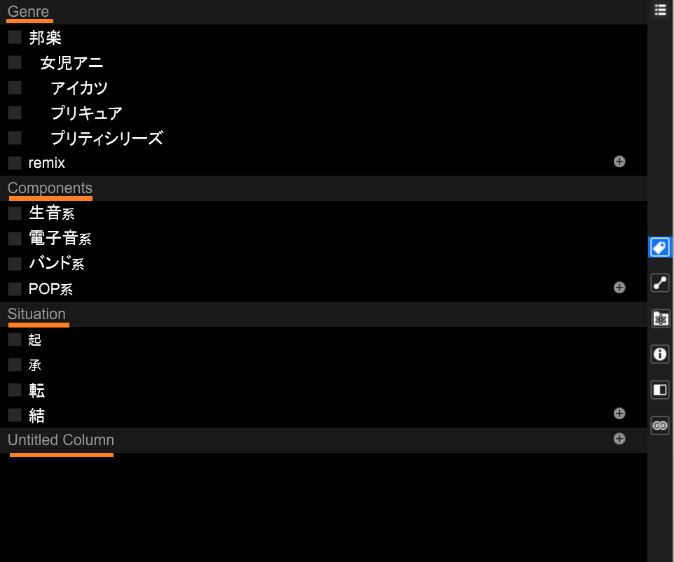 ※以降のカテゴリは正直なところ自分もタグ付けしきれてなくて試している最中なのですが、将来的にこの設定をしていけばもっと選曲が楽になるはずという想定のもと紹介していきます。