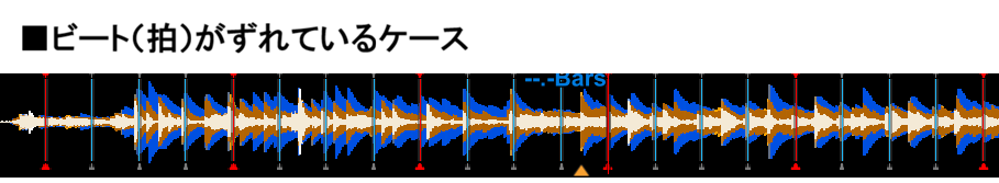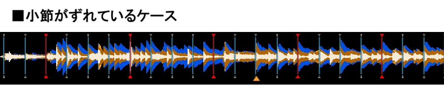 上図の例でいくと、この曲では中央付近にある黄色い「▲」がイントロが開始する位置なので、この位置に赤マークが来るのが期待する姿なのですが、「ビート(拍)がずれているケース」のように全体的に半拍分ずれていたり、「小節がずれているケース」のように小節の開始位置が違っていたり、といったことがちょくちょく起きます。
