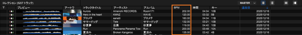 曲をインポート時、rekrordboxが楽曲の波形を解析してその曲のBPMを設定してくれます。
