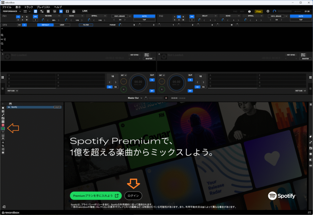 最新バージョンのrekordboxではコレクション画面左にSpotifyのアイコンが追加されています。