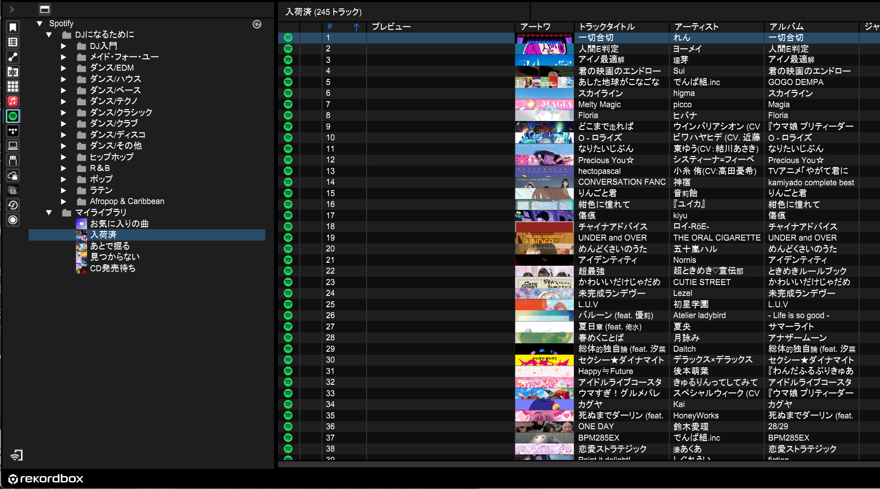 各プレイリストを選択すると、Spotify側でそのプレイリストに登録している曲がrekordboxでも表示されます。
